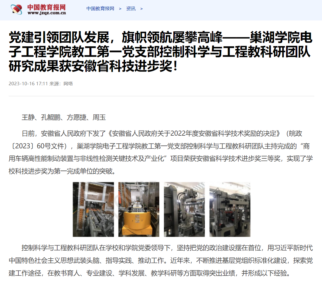 2023年10月16日,中國教育報網在資訊板塊,以《黨建引領團隊發展,旗幟領航屢攀高峰——巢湖學院電子工程學院教工第一黨支部控制科學與工程教科研團隊研究成果獲安徽省科技進步獎!》為題報道了黨支部的特色品牌。