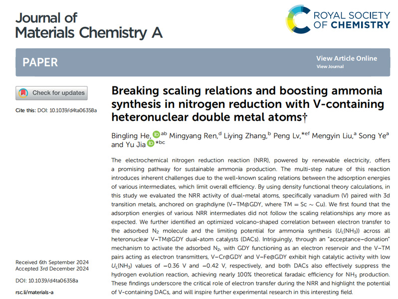 近日,巢湖學院光電能源催化材料與器件研究所赫丙玲副教授在電催化固氮研究上取得了重要突破,相關成果《Breaking scaling relations and boosting ammonia synthesis in nitrogen reduction with V-containing heteronuclear double metal atoms》發表在Journal of Materials Chemistry A。該雜志影響因子為10.7,中國科學院分區為二區TOP期刊。2020級物理學專業本科生任明陽為該論文第二作者。