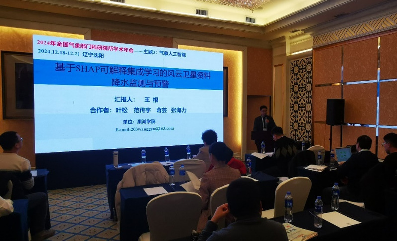 2024年12月18日-21日全國氣象部門科研院所學術年會在遼寧省沈陽市召開。電子工程學院王根副教授應邀參加并在氣象人工智能會場作了題為《基于SHAP可解釋集成學習的風云衛星資料降水監測與預警》的口頭報告。