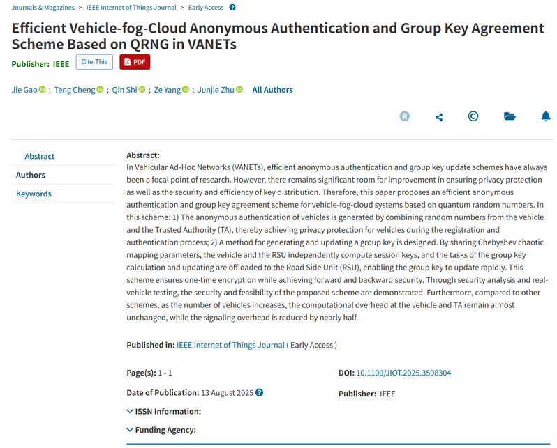 近日,電子工程學院高杰博士在《IEEE Internet of Things Journal》(中科院分區:計算機科學1區/電信學1區)上發表題為《Efficient vehicle-fog-cloud anonymous authentication and group key agreement scheme based on QRNG in VANETs》的研究成果。