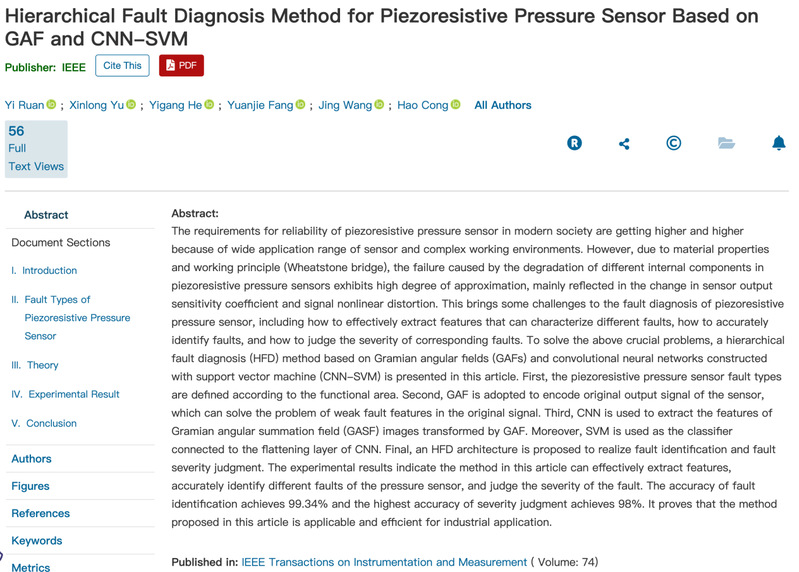 近日,電子工程學院阮義博士在儀器儀表領域高水平期刊《IEEE Transactions on Instrumentation and Measurement》(中國科學院分區:儀器儀表2區)上發表研究成果《Hierarchical Fault Diagnosis Method for Piezoresistive Pressure Sensor Based on GAF and CNN-SVM》。