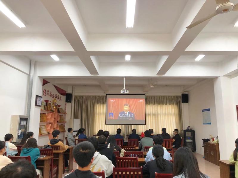 黨的二十大是在全黨全國各族人民邁上全面建設社會主義現代化國家新征程、向第二個百年奮斗目標進軍的關鍵時刻召開的一次十分重要的大會。大會全面總結了新時代以來堅持和發展中國特色社會主義取得的重大成就和寶貴經驗,科學謀劃了未來5年乃至更長時期黨和國家事業發展的目標任務和大政方針,事關黨和國家事業繼往開來,事關中國特色社會主義前途命運,事關中華民族偉大復興。在觀看直播現場,廣大師生邊看邊做好記錄,不時以熱烈的掌聲回應大會精彩報告。