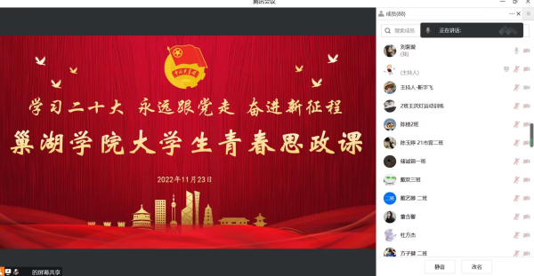 為深入學習宣傳貫徹黨的二十大精神,貫徹落實習近平總書記關于青年工作的重要思想,11月23日下午14:00,巢湖學院舉辦“學習二十大 永遠跟黨走奮進新征程”大學生青春思政課暨第十期團校培訓班專場報告會。本次活動通過騰訊會議線上開展,團委相關老師、第十期團校培訓班全體學員參會學習,活動由校團委學生兼職副書記靳宇飛主持。