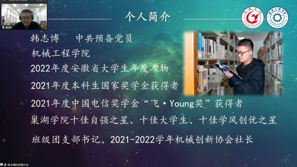 機械工程學院2020級機械設計制造及其自動化專業學生韓志博曾獲第十五屆全國大學生節能減排社會實踐與科技競賽三等獎、第九屆挑戰杯安徽省大學生課外學術科技作品競賽二等獎、第七屆安徽省“互聯網+”大學生創新創業大賽銀獎,主持國家級大學生創新創業項目2項,公開發表學術論文4篇,今年10月獲評2022年度“安徽省大學生年度人物”。會上,他就如何成長成才作題為“矢志創新強國有我”的交流分享,他結合自身參與科研項目、學科競賽的初衷和親身經歷同與會學員分享心得感悟,通過一個個生動的案例勉勵培訓班學員求真務實、真抓實干,珍惜學習機會,保持良好心態,不斷提高創新能力,磨練過硬本領。