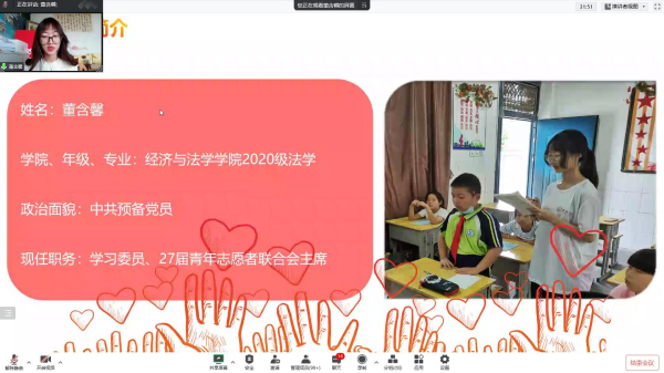 經濟與法學學院2020級法學專業董含馨品學兼優,在積極參與志愿服務的同時,專業成績也名列前茅,曾獲巢湖學院“十佳青年志愿者”榮譽稱號。她從堅定理想信念、志愿奉獻于行、練就過硬本領、此刻年少青春四個方面分享了回顧了自己的大學生活,分享了自己參與愛心助學、愛老敬老、社區服務、疫情防控等方面的志愿服務經歷,從付出與收獲的角度結合大學生活分享個人心得體會,勉勵學員但行好事,莫問前程,用熱情與愛心、專業與堅持校準人生成長航向,樹立遠大理想,在“最好的年紀”用行動和實踐鑄就“最好的青春”,不忘初心,砥礪前行。