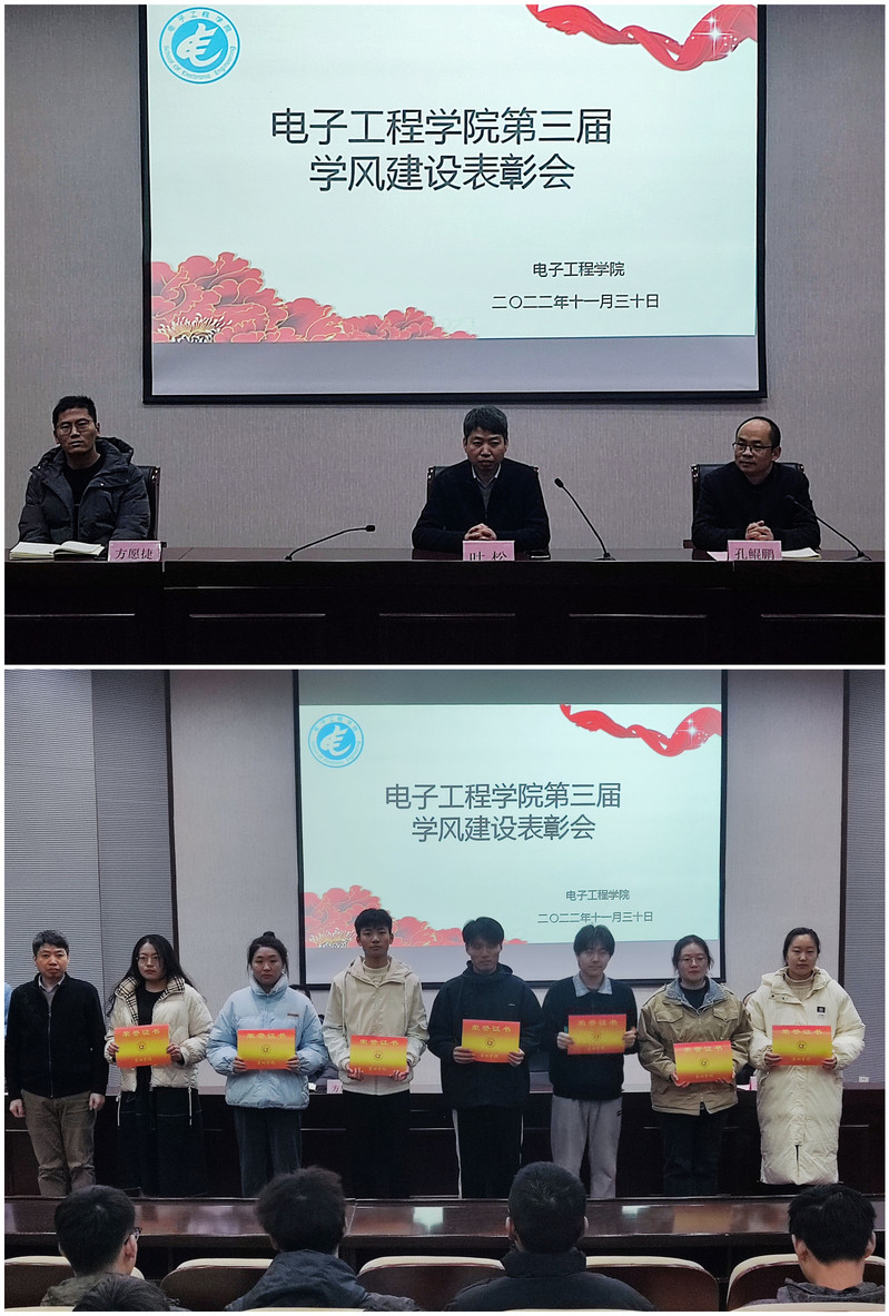 為學習貫徹黨的二十大精神,鞏固“三全育人”綜合改革工作成效,樹典型,立榜樣,促學風,推進學院高質量發展,電子工程學院于11月30日在致知樓報告廳舉辦第三屆學風建設表彰大會,院長葉松、黨委副書記孔鯤鵬、副院長方愿捷出席,會議由輔導員涂靜主持。