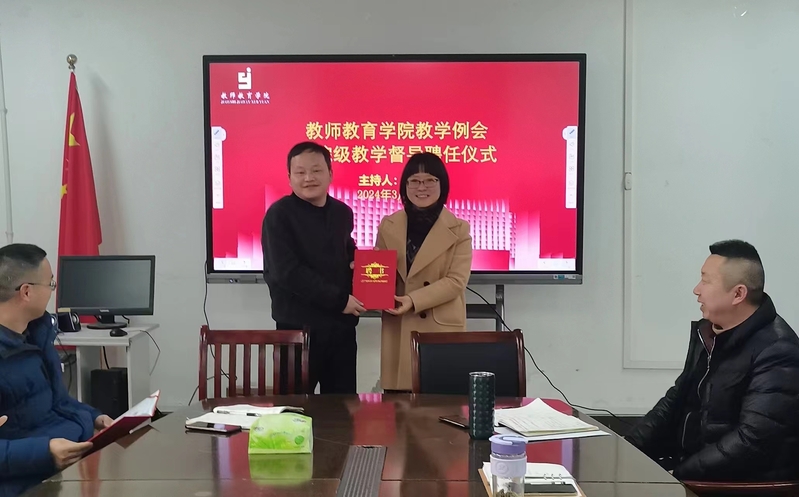 3月13日下午15:00,教師教育學院在院104會議室召開新學期教學例會暨院級教學督導聘任儀式。教學副院長、院系部主任、實驗室主任、專業負責人、教秘辦人員和本院的校院兩級督導全體成員參加,會議由副院長蔡廣主持。