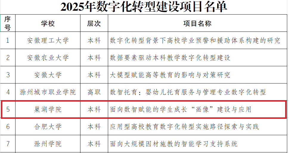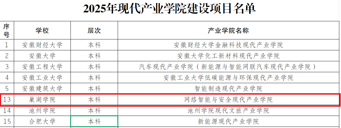 近日,安徽省教育廳公布2025年高校“雙特色”建設(shè)項目名單,巢湖學(xué)院2個項目獲準立項建設(shè),其中,“網(wǎng)絡(luò)智能與安全現(xiàn)代產(chǎn)業(yè)學(xué)院”入選現(xiàn)代產(chǎn)業(yè)學(xué)院建設(shè)項目,“面向數(shù)智賦能的學(xué)生成長‘畫像’建設(shè)與應(yīng)用”項目入選數(shù)字化轉(zhuǎn)型建設(shè)項目。這是學(xué)校繼2024年體育產(chǎn)業(yè)學(xué)入選特色學(xué)科培育建設(shè)項目,體育教育、無機非金屬材料工程兩個專業(yè)入選特色專業(yè)立項建設(shè)項目后,相關(guān)項目再次入選。
