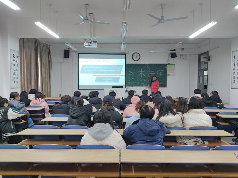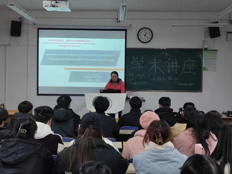 2022年12月4日下午,工商管理學院張潔副教授在博學樓209教室為工商管理學院部分同學做題為“Research on the Architecture of Information System Security Management Platform of Real Estate Management Center”的學術講座。學院部分年輕教師也聆聽了講座。本次學術講座的內容是張潔參加“2022第七屆經濟,管理與社會科學國際會議”的論文交流成果。