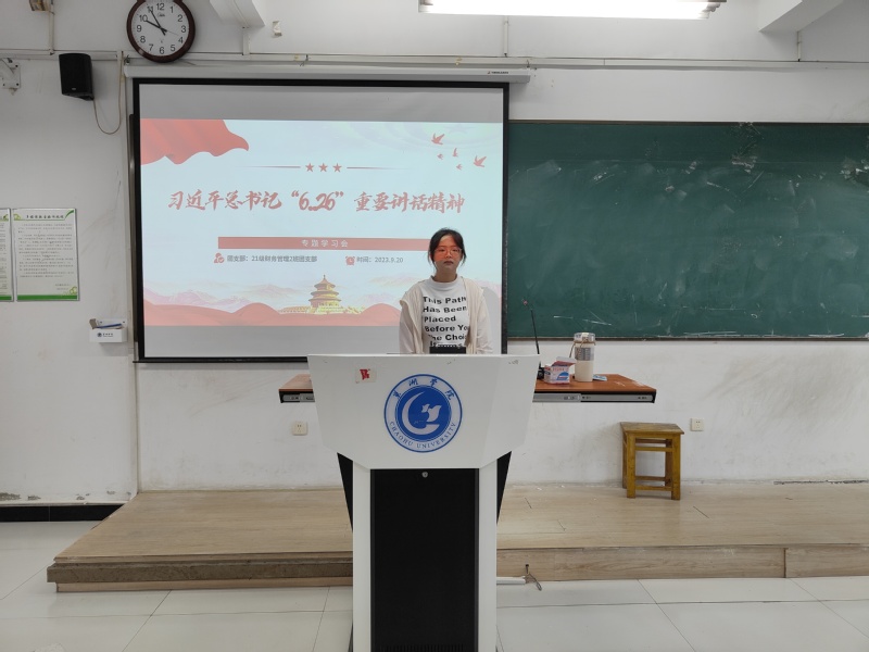 為更好把青年一代團結(jié)凝聚在黨的周圍,為推進強國建設(shè)、民族復(fù)興偉業(yè)接續(xù)奮斗,21級財務(wù)管理二班于9月25日上午在慎思樓北201召開學(xué)習(xí)習(xí)近平總書記“6.26”重要講話話精種專題學(xué)習(xí)會。本次活動由輔導(dǎo)員任潔老師指導(dǎo),團支部書記李旭主持,21級財務(wù)管理二班全體團支部成員參加。