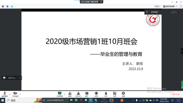 為幫助同學們明確就業方向,更好的實現自身價值與發展,20級市場營銷專業一班于10月9日晚在線上召開了十月班會—畢業生的管理與教育。此次會議由輔導員李夢雨主持,學校黨委學生工作部辦公室秘書胡佳老師出席,20級市場營銷專業一班全體同學參加。