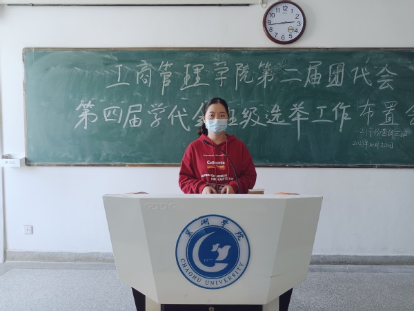 首先,吳齊向同學們介紹團代會和學代會召開的意義,此次的團代會是由工商管理學院舉辦的第二屆團代會,四年舉辦一次,是團內重要的組織制度,是團的民主集中制的重要組成部分,;學代會是代表學生的群眾組織,是同學們在校園體驗社會主義民主政策的重要途徑。隨后,吳齊說明代表的選舉要求,要秉持公開原則,根據既定要求,經過班級推薦選舉,最終暫定班級代表分別為:趙文枝、汪邦連、徐國暉。最后,吳齊對本次會議進行總結,她表示,學生代表大會的意義是非常重大的,希望各學生代表能維護自身權益,合理發聲,不斷提高思想政治素質,為學院發展建設貢獻一份力量。