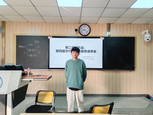 首先,劉阿龍向班級同學介紹了本次會議的主題是推選本次參加團代會和學代會三名學生代表人選。接著,他指出學生代表的具體要求是需要一名學生干部以及二名非學生干部,他鼓勵同學們積極參與。隨后,他采取投票推選的方式,選出適合的人選,參與大會的選舉工作,最終確定人選為劉阿龍,代嘉莉,胡捷三名同學。最后,他表示本次會議是聯系廣大同學的橋梁和紐帶,團結引領廣大同學矢志奮斗心向黨,在實現中華民族偉大復興中國夢的進程中奮力書寫工商管理學院學生會工作青春篇章。