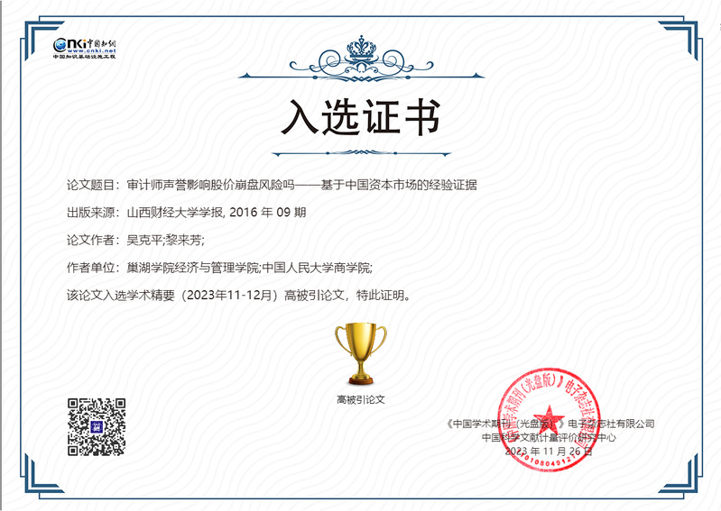 根據中國知網中國科學文獻計量評價中心的數據顯示,巢湖學院工商管理學院吳克平博士于2016年以巢湖學院為第一單位在《山西財經大學學報》 (CSSCI,影響因子6.605)發表的論文“審計師聲譽影響股價崩盤風險嗎--基于中國資本市場的經驗證據”成功入選學術精要(2023年11-12月)高被引論文。論文運用2002-2014年中國資本市場的數據,檢驗了審計師聲譽與股價崩盤風險之間的關系。研究發現:審計師聲譽與股價崩盤風險呈顯著的負相關關系;在市場化程度較低的地區,在會計信息透明度較低、經營業績較差、成長性較低的公司,審計師聲譽與股價崩盤風險皆呈更顯著的負相關關系。研究結果表明,發揮審計師聲譽的外部監控作用、加快市場化進程、提高會計信息透明度、提高公司經營業績、增強公司的成長性等有助于降低股價崩盤風險,進而助力新常態下中國資本市場的良性運行與健康發展。