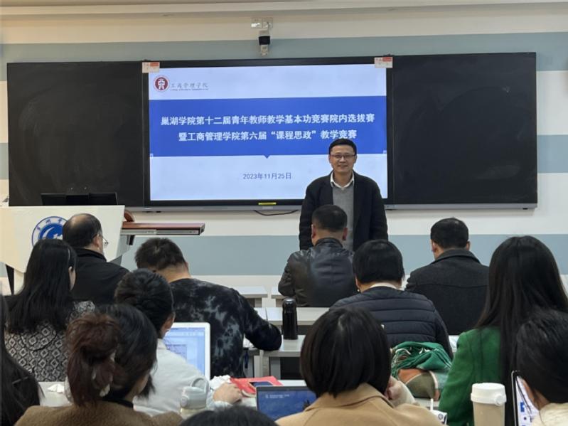 為深入學習貫徹習近平新時代中國特色社會主義思想,落實立德樹人根本任務,充分挖掘和豐富課程育人內涵,發揮課堂教學育人主渠道作用,提升青年教師教學能力與教學水平,工商管理學院與11月25日在博學樓410教室舉辦巢湖學院第十二屆青年教師教學基本功競賽院內選拔賽暨工商管理學院第六屆“課程思政”教學競賽。本次競賽共有10名教師報名參賽,由學院學術委員會委員、教學督導擔任競賽評委。學院黨委書記管超、院長陶有田、全體教師全程參與觀摩。競賽由陶有田主持。