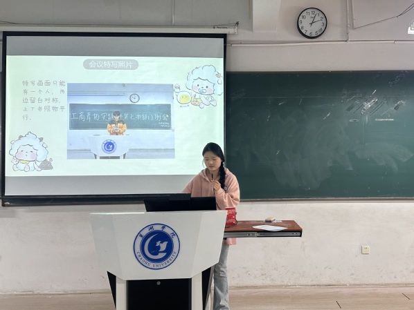 會上,儲嵐霖從四個方面介紹新聞稿的撰寫要求。她提出,新聞稿的撰寫應避免模式化,可以靈活使用各種表達讓新聞稿活起來。在講解照片拍攝這一方面,儲嵐霖通過去年和今年相同活動的照片對比說明照片應生動體現活動內容。接著,竇良晨對動態稿件的撰寫做出系統梳理并進行了詳細的介紹,她指出動態稿的撰寫應該包括事件、時間、地點、人物、原因這五個要素,并詳細地解釋了會議、比賽、活動這三個常見動態稿的書寫要求。隨后,李曉靜向大家講解了照片拍攝具體要求,她介紹了會議照片主要包括特寫照片、側寫照片和全景照片并具體講述了如何拍攝會議照片,并介紹了拍攝前需要準備的步驟,向大家列舉圖片進行詳細介紹。最后,會長胡書怡對新聞稿如何撰寫作出總結,她著重強調了新聞稿的書寫格式和內容要求以及新聞稿的打包格式。
