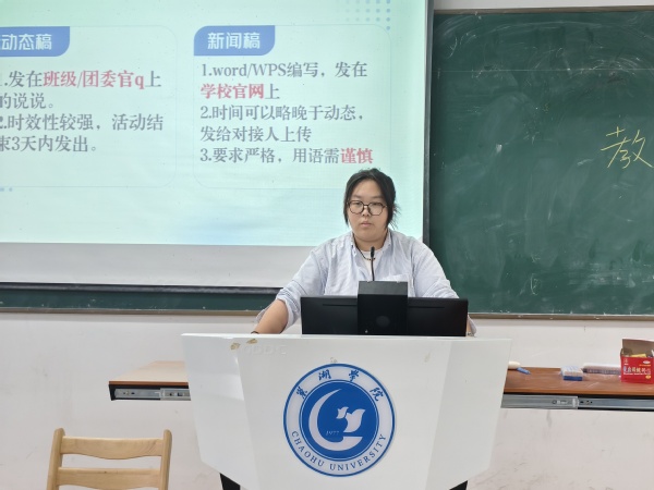 首先,張金晶介紹了班級動態、部門動態和新聞稿的內容和形式,并通過稿件框架和例文圖片的展示讓同學們更加直觀地了解稿件的寫作精髓。接著,張金晶將通訊稿的寫稿步驟列成表格形式并一一展現,便于同學們掌握稿件段落的順序和邏輯。她從視角,名稱,語言邏輯等多個角度向同學們說明了撰寫新聞稿與動態稿的注意事項,強調格式要求和語句要求的嚴謹性,并指出要嚴格遵循通訊稿的時效性。隨后,張金晶指出配圖的比例和拍照方式的要求,從特寫、側寫、全景三個角度以圖片實景為同學們詳細講解拍照技巧和方法。最后,張金晶希望同學們將宣傳工作相關技能做到“兩步走”,從不會到會,從會到好,以飽滿熱情的態度投入宣傳工作當中。