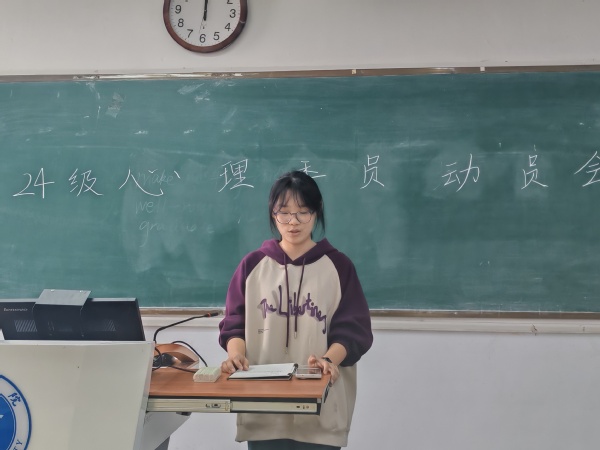 為提升心理委員工作專業能力和水平,加強心理健康工作團隊建設,更好地呵護全體學生身心健康,工商管理學院學生會實踐部于10月15日在博學樓102教室召開24級心理委員動員會。此次會議由實踐部負責人胡琪主持,24級全體心理委員參加。