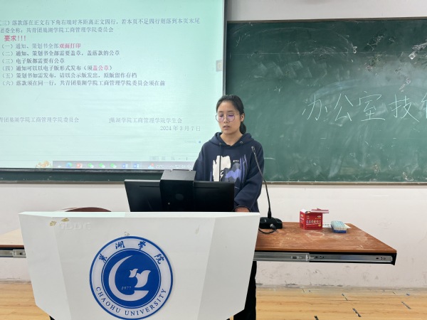 首先,原譽珊介紹了本次培訓的主要內容,強調了掌握辦公軟件技能對于學生干部的重要性,通過實例演示和實際操作,詳細講解了文件格式的要求。接著,原譽珊介紹了策劃書和通知的結構、內容要求及注意事項,規范了文件取號制度的工作流程,著重強調段落格式要求和落款位置的規范性與完整性。隨后,原譽珊結合實際案例讓學生干部更加清晰的了解如何撰寫策劃書和通知,并通過現場問題引導的方式,更直觀的展現了辦公軟件在工作中的常規操作和易錯點。最后,原譽珊培訓了如何制作表格以及制作表格中需要注意的細節,同時希望各位學生干部不斷提升自身政治素養,強化業務能力,為工商管理學院的發展注入新活力。