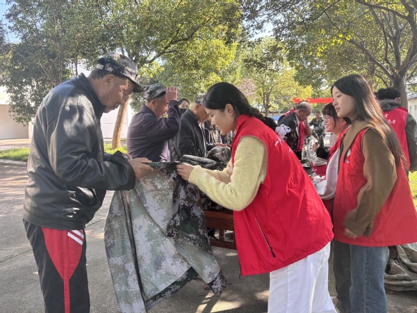 溫情派送,貼心服務。活動前期,志愿者在校內組織回收整理軍訓服裝。當老人們陸續來到食堂門前時,志愿者面帶微笑,有條不紊地向老人們分發。活動過程中,志愿者與老人們展開了耐心而細致的交流。他們彎下腰,湊近老人,認真傾聽老人們的話語,全面了解老人們的實際需求。對于那些不太清楚自己適合哪種尺碼的老人,志愿者根據老人的身材特點,貼心地為他們推薦合適的軍訓服,并幫助他們試穿。對于行動不便的老人,志愿者們主動挑選合適的衣服,送去老人的房間。