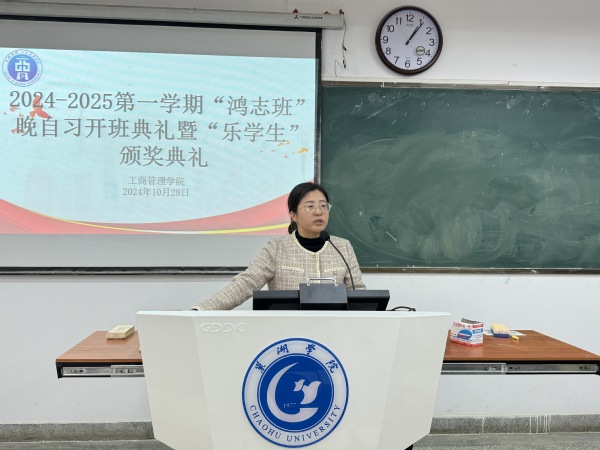 為切實加強學(xué)院學(xué)風(fēng)建設(shè),營造優(yōu)良學(xué)習(xí)氛圍,提升同學(xué)們的自主學(xué)習(xí)能力,引導(dǎo)學(xué)生養(yǎng)成良好學(xué)習(xí)習(xí)慣,工商管理學(xué)院于10月28日中午在博學(xué)樓504教室隆重舉行2024年秋學(xué)期“鴻志”晚自習(xí)班開班儀式暨“樂學(xué)生”頒獎典禮。此次活動由學(xué)生管理專項負(fù)責(zé)人汪鵬程主持,院黨委副書記金晶、團委書記許沙出席,“鴻志”晚自習(xí)班全體學(xué)生參與。