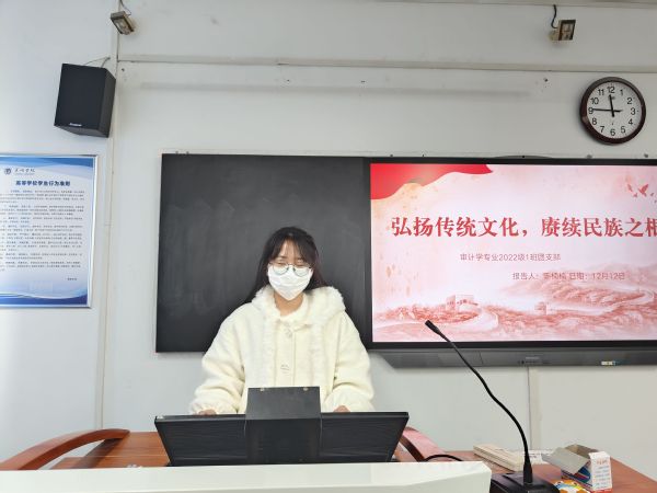 為弘揚(yáng)中華優(yōu)秀傳統(tǒng)文化,堅(jiān)定文化自信,增強(qiáng)同學(xué)們對(duì)傳統(tǒng)文化的認(rèn)同感、歸屬感和自豪感,22級(jí)審計(jì)學(xué)專業(yè)于12月12日中午在博學(xué)樓314教室開(kāi)展了“弘揚(yáng)傳統(tǒng)文化,賡續(xù)民族之根”主題團(tuán)日活動(dòng)。本次活動(dòng)由團(tuán)支書(shū)陳楠楠主持,22級(jí)審計(jì)學(xué)專業(yè)全體同學(xué)參與。