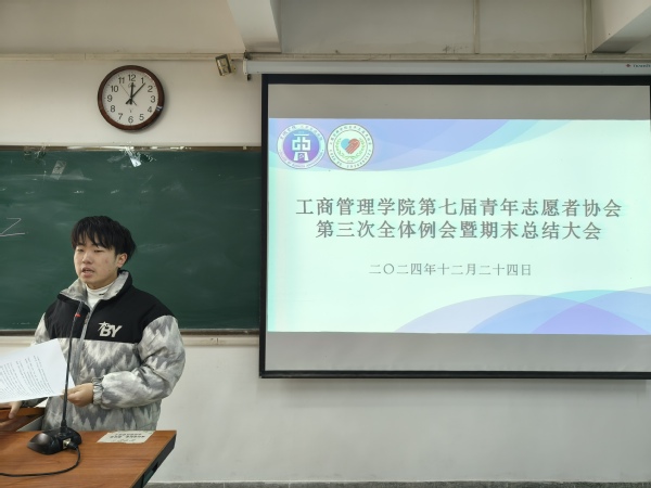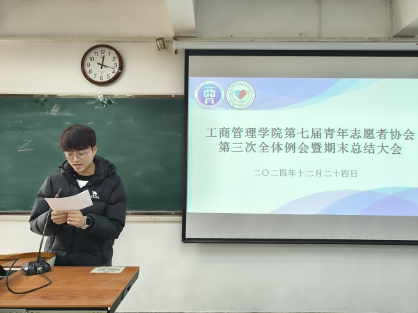為總結本學期的工作成果,部署下一階段的工作任務,工商管理學院第七屆青年志愿者協會于12月24日中午十二點在博學樓102教室召開第三次全體例會暨期末總結大會。此次會議由工商青協會長張建忠主持,團委副書記儲嵐霖出席并指導,工商青協全體成員共同參加。