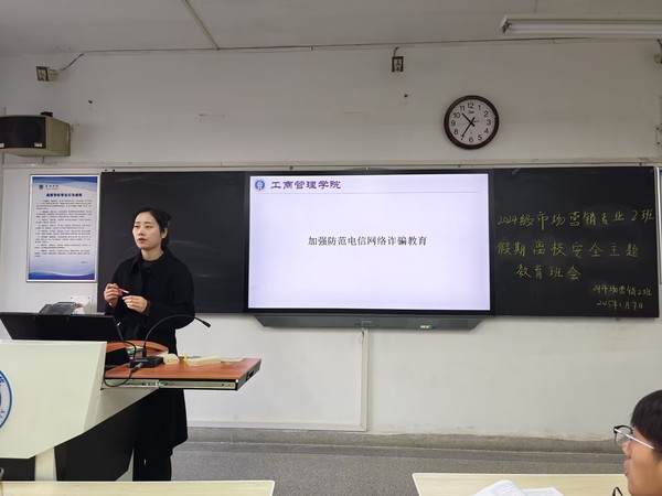 首先,袁曉琳強(qiáng)調(diào)了期末考試的重要性,叮囑各位同學(xué)要遵守考場紀(jì)律,好好復(fù)習(xí),切勿作弊。接著,她提醒同學(xué)們在假期離校前打掃好寢室衛(wèi)生,帶好貴重物品,人走斷電并鎖好門窗。同時,告誡同學(xué)們在回家途中一定要乘坐正規(guī)的交通工具,乘車時系好安全帶,并跟親友同步自己的乘車信息。旅途中不要輕信陌生人,注意飲食安全,到家第一時間在班級群里回復(fù)“姓名+已安全到家”。隨后,袁曉琳建議同學(xué)們合理規(guī)劃自己的假期生活,飲食、作息規(guī)律,若外出游玩時務(wù)必注意安全。最后,袁曉琳再次告誡同學(xué)們防范電信詐騙,不要因?yàn)榧倨诘牡絹矶潘闪司枰庾R,假期兼職要合理合法,切勿刷單。