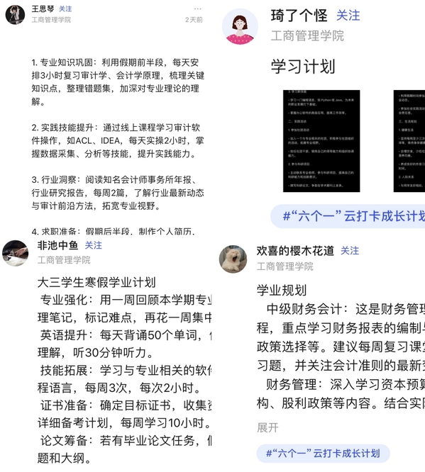 ??在寒假時光里,同學(xué)們依據(jù)各自的年級特點和專業(yè)方向,靈活運用大學(xué)生職業(yè)生涯規(guī)劃課程所學(xué)的知識,精心為自己繪制專屬的學(xué)習藍圖,如同為即將啟航的船只校準了方向,蓄滿了動力。