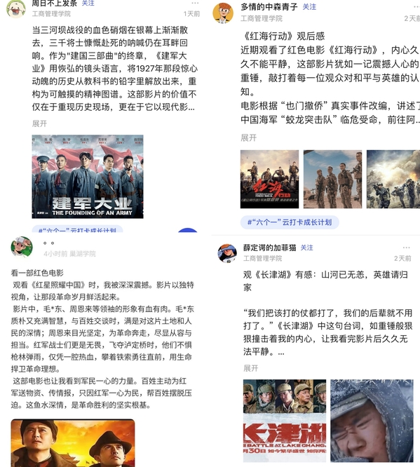??寒假期間,同學(xué)們觀看《紅星照耀中國》《建軍大業(yè)》《長津湖》等經(jīng)典影片,深入了解了歷史和先烈,了解那些感人至深的英雄事跡和波瀾壯闊的歷史畫卷。通過觀影,同學(xué)們更加堅定了對中國特色社會主義的信念,更加珍惜當下的幸福生活。