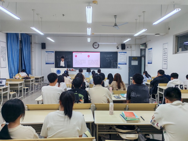 活動伊始,潘欣介紹此次團日的活動主題與意義,號召同學們以實際行動踐行五四精神。隨后開展三項子活動。第一項子活動為“詩頌五四情,筆繪青春志”。前期征集的優(yōu)秀海報與詩歌作品在現(xiàn)場展示。海報以鮮明的色彩和創(chuàng)意構圖,生動展現(xiàn)五四青年的熱血擔當;詩歌作品則以細膩筆觸書寫青年與時代同頻的心聲。同學們深情朗讀原創(chuàng)詩歌,展現(xiàn)新時代青年的奮斗風采與國家情懷。第二個子活動為“五四知競答,青春音識曲”室內游園會。在黨史知識競答環(huán)節(jié),設置“中國共青團成立時間”“二十大報告新發(fā)展理念”等題目。同學們隨機抽取題目作答,現(xiàn)場氣氛熱烈,尤其在“黨的一大召開地點”等問題上展開討論,正確率超90%,展現(xiàn)出同學們扎實的理論知識儲備;“紅色旋律回響”環(huán)節(jié),《東方紅》《團結就是力量》等經(jīng)典紅歌片段循環(huán)播放。《歌唱祖國》的片段引發(fā)全場合唱。同學們在競猜中深化對紅色文化的認知,在音符中追溯革命歲月。第三個子活動為“光影映五四,青春向未來”。活動選取紅色影片《建黨偉業(yè)》中相關經(jīng)典片段進行展播。影片生動再現(xiàn)了百年前青年學子振臂高呼“外爭主權,內除國賊”的熱血場景,以及革命先驅在動蕩時局中探尋救國道路的堅定身影。觀影過程中,同學們全神貫注,被影片中先輩們“以青春之我,創(chuàng)建青春之國家”的豪情深深感染。觀影結束后,現(xiàn)場展開熱烈討論。有同學分享道:“看到影片中同齡人在國家危亡時刻挺身而出,讓我深刻理解五四精神不僅是歷史符號,更是當代青年的行動指引。”最后,團支部書記引導大家結合自身專業(yè),探討新時代青年如何將愛國熱情轉化為奮斗動力,現(xiàn)場交流氛圍濃厚,進一步強化同學們的使命意識與集體凝聚力。