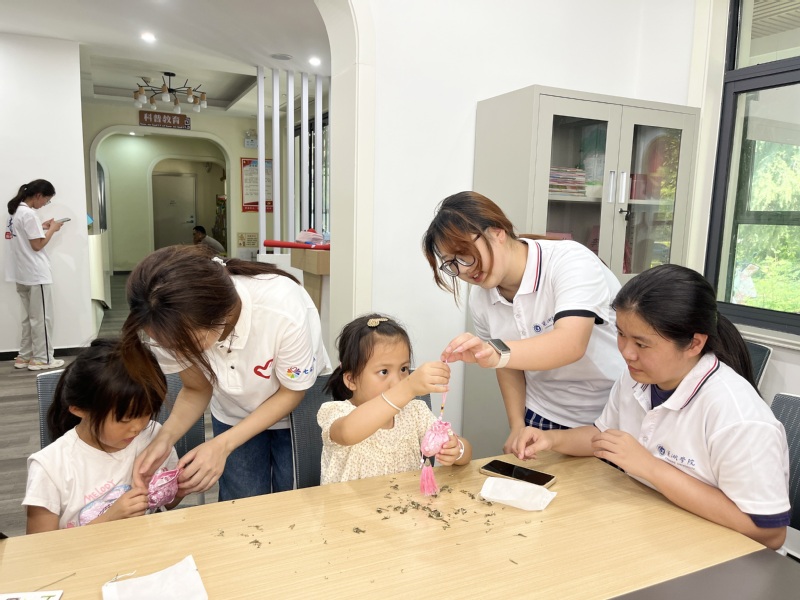 首先,祝明若以充滿地域特色的安徽中醫(yī)小故事切入,用生動(dòng)語(yǔ)言為小朋友們講述中醫(yī)藥從萌芽到興盛的千年發(fā)展脈絡(luò)。接著,她帶領(lǐng)小朋友們一起學(xué)習(xí)《中醫(yī)謠》,逐句解析“陰陽(yáng)五行”“理法方藥”等核心概念,通過(guò)集體誦讀與視頻學(xué)習(xí),帶孩子們領(lǐng)略中醫(yī)文化的韻律之美。隨后,祝明若圍繞夏季健康主題,開(kāi)設(shè)趣味課堂,將刮痧防中暑技巧、食療解暑方及草藥驅(qū)蚊竅門等知識(shí),轉(zhuǎn)化為貼近生活的生動(dòng)講解。最后,團(tuán)隊(duì)成員化身“小導(dǎo)師”,指導(dǎo)小朋友們通過(guò)趣味拼圖的方式觀察藥材形態(tài)、學(xué)習(xí)藥用價(jià)值,進(jìn)一步鞏固中醫(yī)藥知識(shí),并分組帶領(lǐng)小朋友們手工香囊制作,從選料、縫制到填充全程耐心指導(dǎo)。小朋友們捧著親手制作的香囊,與團(tuán)隊(duì)成員合影留念,歡聲笑語(yǔ)中,中醫(yī)藥文化“可觸可聞”的獨(dú)特魅力得以生動(dòng)展現(xiàn),在孩子們心中種下了傳承中醫(yī)藥文化的種子。