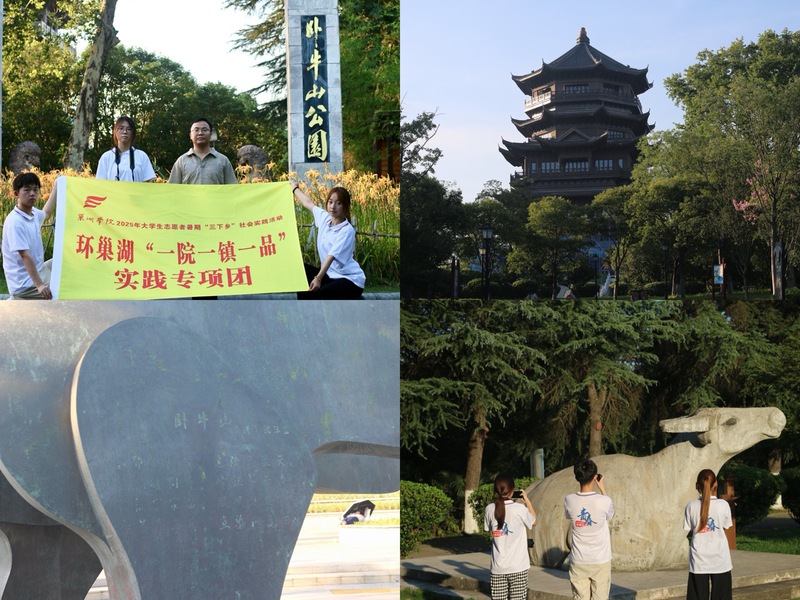 池畔尋幽,古韻康養,洗耳池公園承載“許由洗耳”典故,如今以典故為魂,是展現地方文化的重要窗口,實踐團成員入園挖掘文化內涵,池畔垂柳拂水、錦鯉游弋,老人們對弈的吆喝聲勾勒生活圖景,駐足“洗心橋”感受歷代文人滌蕩心境的故事,用鏡頭記錄園林之美,領略風光與傳統文化魅力。山間攬勝,文脈風華,臥牛山公園內“臥牛奮蹄”銅牛雕塑展現巢湖人民勤勞拼搏精神,修繕中的文昌閣紅墻黛瓦,曾是文人吟詩作對之地,歷史韻味與新貌相得益彰,吸引游客感受傳統文化。靈龜沐霞,康養新程,龜山公園因形似巨龜得名,承載神龜守護的傳說,是探索中醫文化的重要一站,傍晚時分,團隊定格夕陽下“靈龜看湖”的奇觀,漫步環山步道感受湖風草木芬芳,這里既是賞景佳處,也是游客調養身心的熱門選擇。