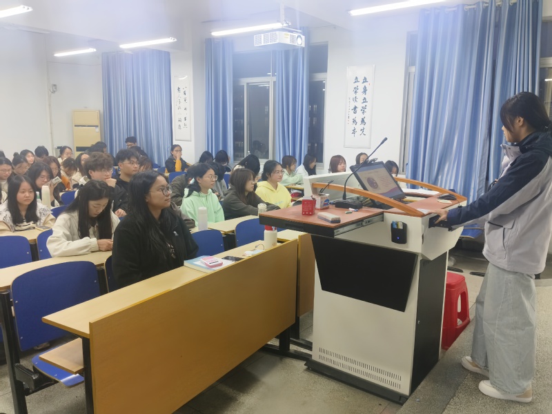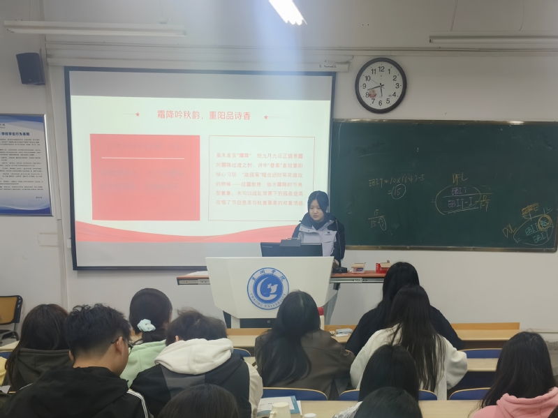 首先,周璇簡要介紹本次團日活動的主題與目的,旨在鼓勵同學們在活動中用心感受節(jié)氣變遷與增強文化自信。同時,周璇指出本次活動共分為三個部分:節(jié)氣文化分享、古詩品讀與創(chuàng)意手工體驗。接著,在“尋秋知節(jié)氣”環(huán)節(jié),同學們踴躍展示自己拍攝的霜降節(jié)氣與重陽節(jié)日相關照片,不僅記錄自然之美,也傳遞出濃濃的節(jié)日溫情。隨后,周璇帶領大家共同學習唐代詩人岑參的《行軍九日思長安故園》,在詩香中品味古人重陽思鄉(xiāng)的深情,感受傳統(tǒng)文化的厚重底蘊。最后,周璇鼓勵同學們積極參與圍繞霜降節(jié)氣或重陽節(jié)日,創(chuàng)作手工、繪畫或線上作品,在實踐中體悟傳統(tǒng)之美,以此次活動為契機,進一步增強對中華優(yōu)秀傳統(tǒng)文化的認同感與傳承意識。
