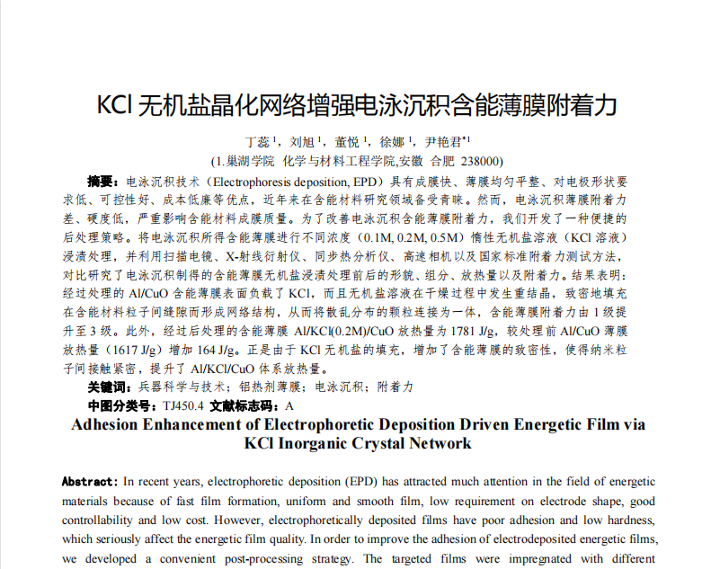 《兵工學報》創刊于1979年,由中國兵工學會主辦,中國科學技術協會主管,是我國國防科技領域最具影響力的學術期刊之一,被國際上著名的檢索機構美國《工程索引》(EI)收錄,其綜合評價指標一直名列兵工技術類科技期刊的首位。丁蕊在發表的《KCl無機鹽晶化網絡增強電泳沉積含能薄膜附著力》文章中,提出了惰性無機鹽KCl晶化網絡強化Al/CuO薄膜附著力的策略,為高性能微納含能器件的開發及應用提供了新思路。