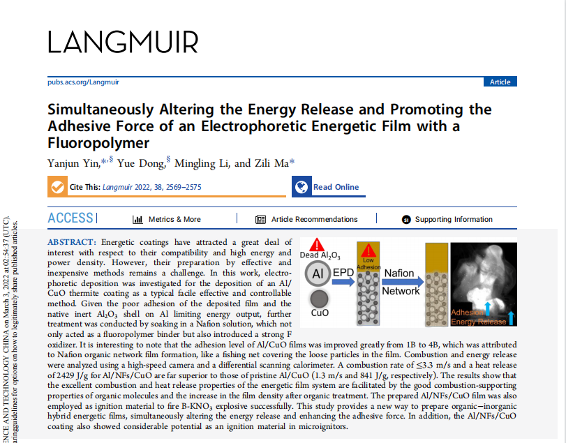 《Langmuir》創刊于1985年,是美國化學學會出版的期刊之一,現任主編為多倫多大學化學系的教授Gilbert C.Walker,2021年的影響因子為3.882,JCR分區為化學大類2區TOP。董悅在發表的《Simultaneously Altering the Energy Release and Promoting the Adhesive Force of an Electrophoretic Energetic Film with a Fluoropolymer》文章中,首次將NFs 117引入能量材料系統用來增強鋁熱劑薄膜的附著力,為新型高能器件的開發和應用提供了研究依據。