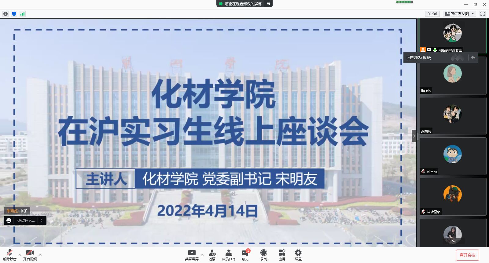 4月14日下午,化學與材料工程學院黨委副書記宋明友、畢業班輔導員通過視頻連線在滬學生,了解他們的生活、學習和工作情況,為他們送去學院的慰問和關懷。