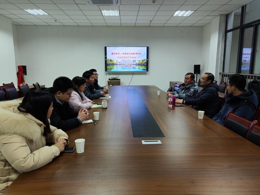 2月17日下午,巢湖學院-安徽霏潤新能源材料產業研究院在化材學院會議室召開工作會議謀劃2023年度主要工作。會議由李宏林主持。安徽霏潤董事長吳國寶、技術總監王安苗博士、工程師王金銀、巢湖學院化材學院副院長王小東、李宏林及產業研究院新能源方向骨干教師參加會議。