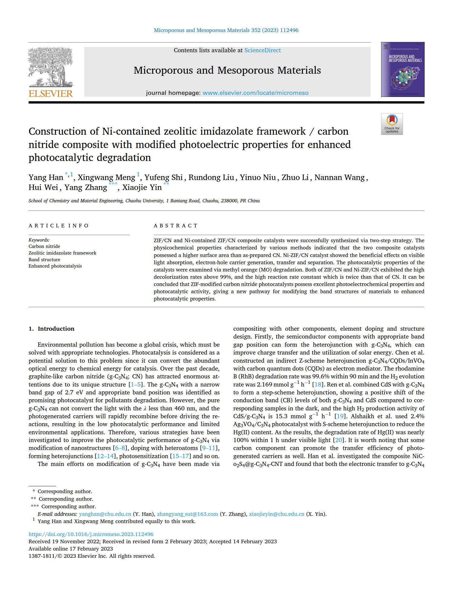近日,我院韓陽博士在光催化復合材料研究中取得進展,相關成果以“Construction of Ni-contained zeolitic imidazolate framework / carbon nitride composite with modified photoelectric properties for enhanced photocatalytic degradation”為題發(fā)表在國際權威期刊Microporous and Mesoporous Materials。