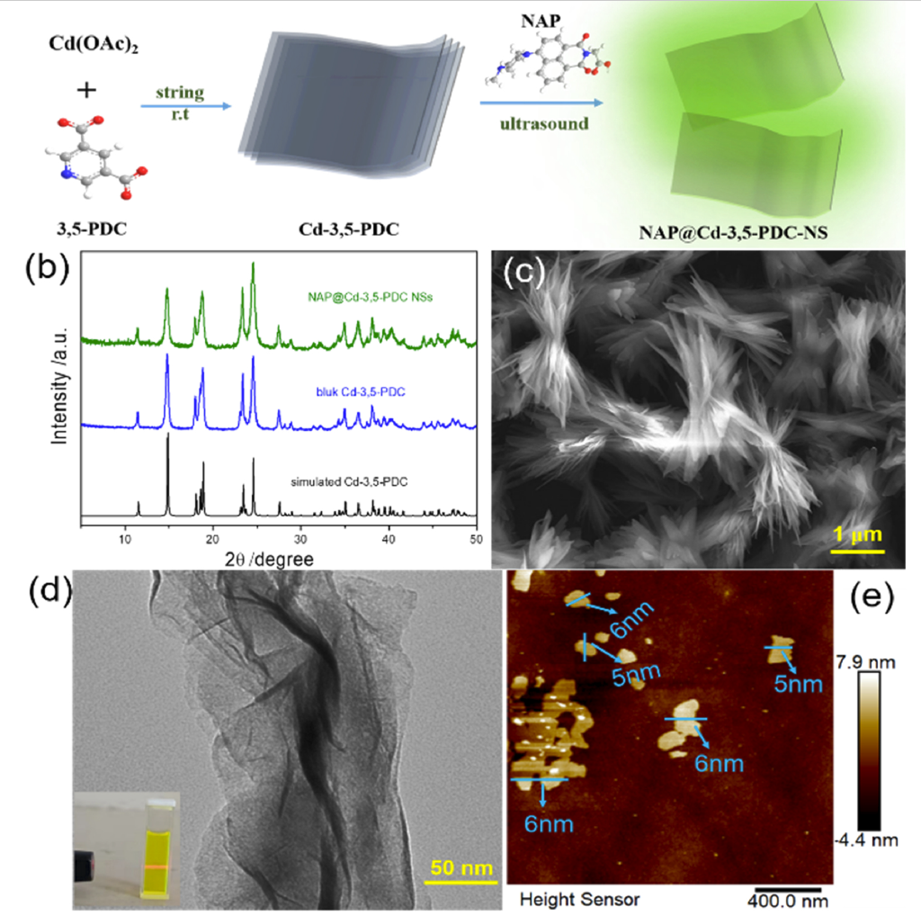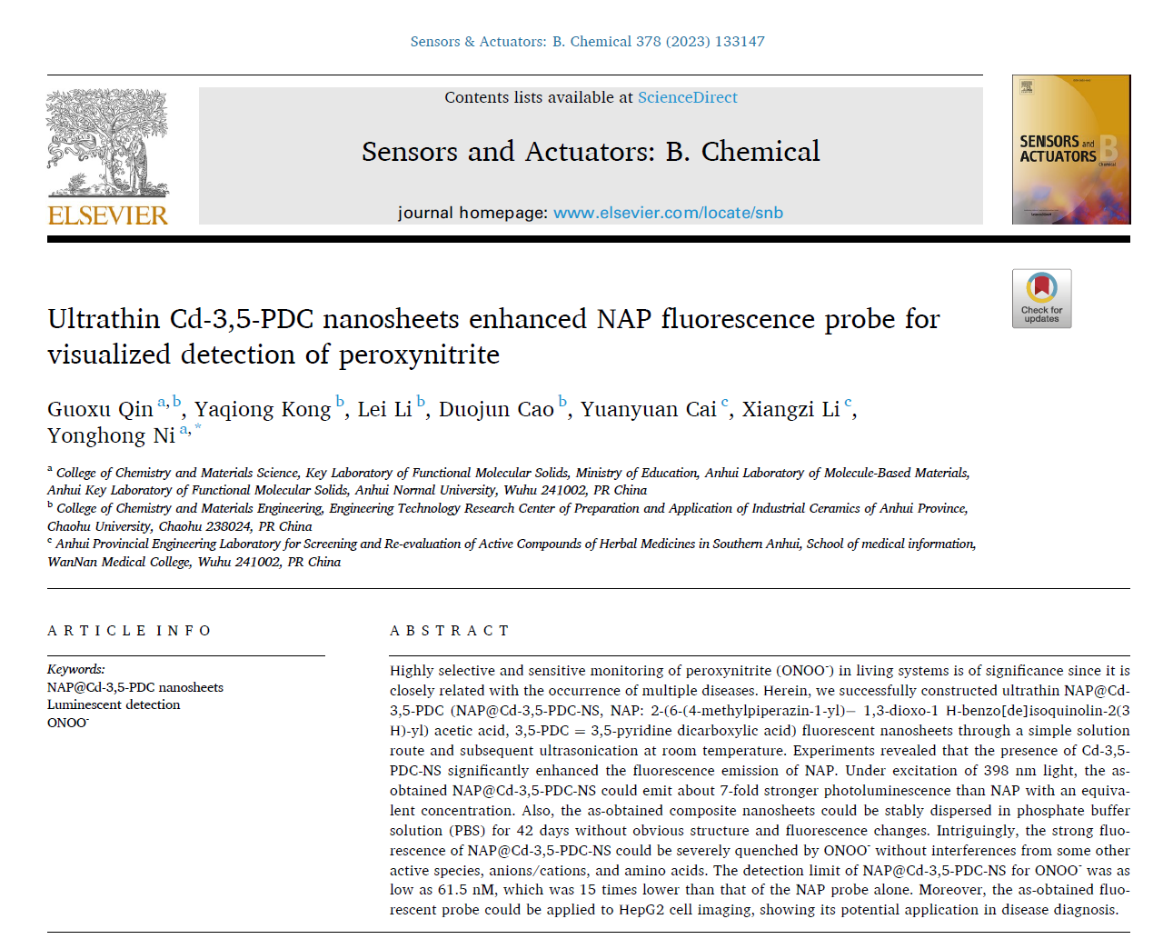 近日,我院秦國旭教授在熒光傳感器研究中取得進(jìn)展,相關(guān)成果以“Ultrathin Cd-3,5-PDC nanosheets enhanced NAP fluorescence probe for visualized detection of peroxynitrite”為題發(fā)表在國際期刊Sensors and Actuators B-Chemical(中科院一區(qū),IF:9.221)。