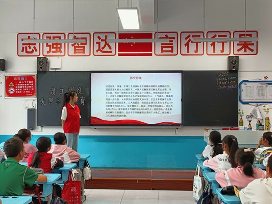 接著,白瓊講述了渡江戰役的戰爭經過和戰爭結果,讓同學們對這場位于解放戰爭時期,中國人民解放軍第二野戰軍、第三野戰軍和第四野戰軍一部,在長江中、下游地區對國民黨軍進行的規模巨大的以勝利為結尾的強渡江河戰役有了更深層次的了解。最后,白瓊向同學們著重介紹渡江戰役的意義,然后和青年志愿者帶領同學們合唱《我和我的祖國》。至此,本次支教活動圓滿結束。