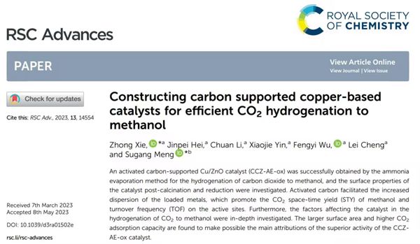 近日,化材學院綠色能源化工科研團隊謝忠博士在高性能Cu/ZnO催化劑研究中取得新進展,相關成果以“Constructing Carbon supported copper-based catalysts for efficient CO2 hydrogenation to methanol”為題發表在國際權威期刊《RSC Advances》(SCI收錄,IF:3.9)。