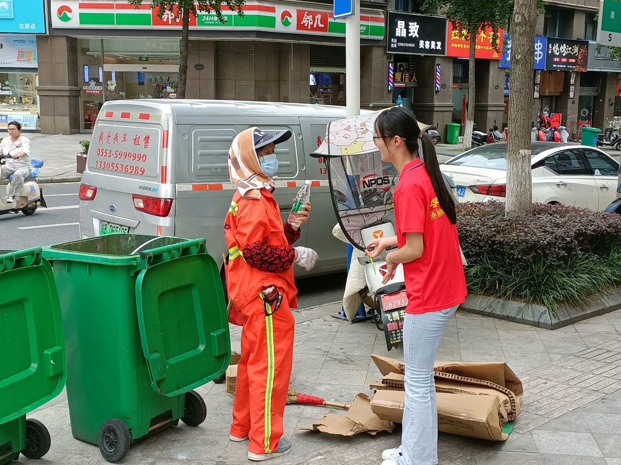 活動伊始,隊長陶雨濛向各位隊員分配任務,強調一些任務細節。接著,陶雨濛帶領隊員們向環衛工人及外賣員說出自己的感謝并向他們送水來表達自己內心的敬意,叔叔阿姨們也開始拉著隊員們聊天,告訴我們他們的喜悅、向我們分享他們的日常生活。