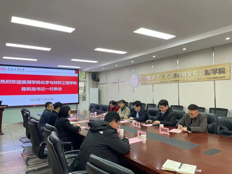 呂珺對(duì)陳和龍一行的到來(lái)表示熱烈歡迎,并簡(jiǎn)要介紹了合肥工業(yè)大學(xué)材料科學(xué)與工程學(xué)院基本情況。陳和龍對(duì)合肥工業(yè)大學(xué)材料科學(xué)與工程學(xué)院的熱情接待表示感謝,并介紹了巢湖學(xué)院化學(xué)與材料工程學(xué)院基本情況。