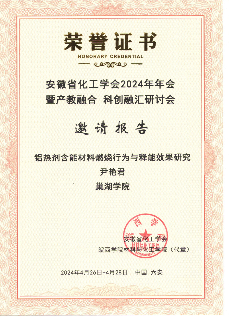 中國科技大學教授徐銅文、南京理工大學教授鐘秦、東華工程科技股份有限公司總工程師喻軍等專家分別作大會主旨報告。專題報告第一階段,合肥工業大學教授陸楊、安徽師范大學教授方臻、安徽大學苗繼斌、安慶師范大學教授王鈞偉等專家就產教融合、專業建設、化工類專業課程的改革與應用型人才的培養等方面內容作了報告;專題報告第二階段,安徽大學郭立升、安徽理工大學毛立睿、合肥大學王青等專家就科創融匯與科技創新等方面作了相關學術報告。我校化材學院尹艷君老師在“科創融匯、科技創新”專題報告中作題為“鋁熱劑含能材料燃燒行為與釋能效果研究”學術報告,受到在場學者的廣泛關注。