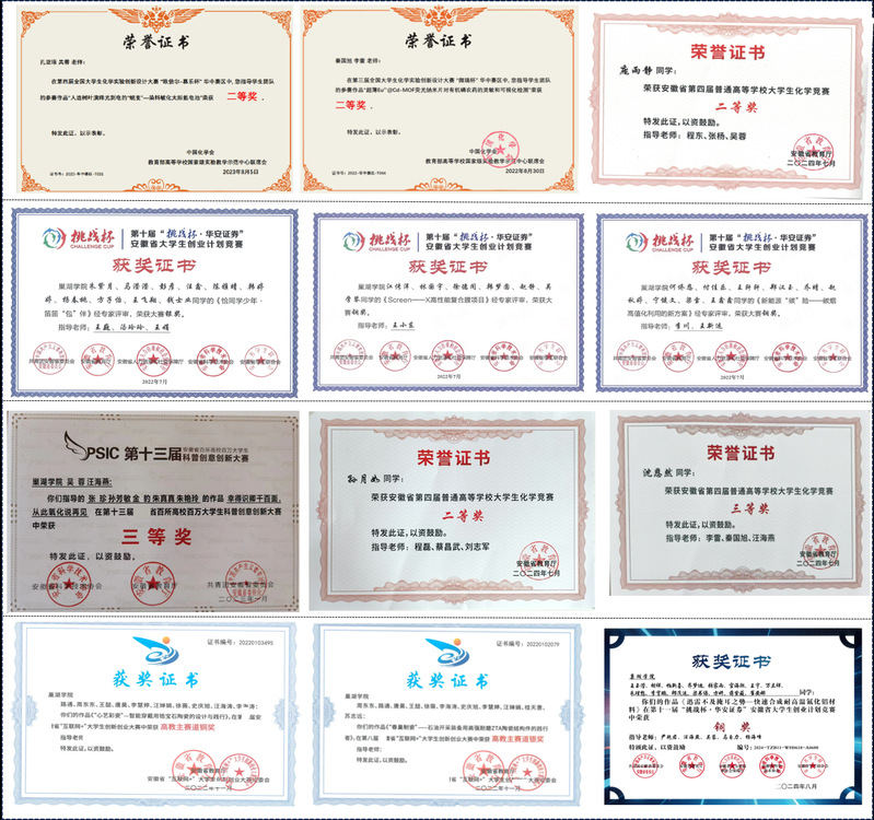 教科研成果:近五年,本專業(yè)教師主持或參與各級(jí)各類教科研項(xiàng)目50余項(xiàng),其中主持國(guó)家自然科學(xué)基金青年項(xiàng)目1項(xiàng)、省部級(jí)教科研項(xiàng)目20余項(xiàng),發(fā)表高水平學(xué)術(shù)論文100余篇,授權(quán)國(guó)家發(fā)明專利10余件。大學(xué)生創(chuàng)新創(chuàng)業(yè)訓(xùn)練項(xiàng)目成功獲批國(guó)家級(jí)5項(xiàng),省級(jí)14項(xiàng),校級(jí)30余項(xiàng),并在大學(xué)生化學(xué)競(jìng)賽、全國(guó)大學(xué)生專利創(chuàng)新大賽、“挑戰(zhàn)杯”全國(guó)大學(xué)生課外學(xué)術(shù)科技作品競(jìng)賽和創(chuàng)業(yè)計(jì)劃大賽、 “互聯(lián)網(wǎng)+”大學(xué)生創(chuàng)新創(chuàng)業(yè)大賽、全國(guó)大學(xué)生化學(xué)實(shí)驗(yàn)創(chuàng)新設(shè)計(jì)大賽、安徽省百所高校百萬(wàn)大學(xué)生科普創(chuàng)意創(chuàng)新大賽等省級(jí)以上學(xué)科競(jìng)賽中取得優(yōu)異成績(jī)。