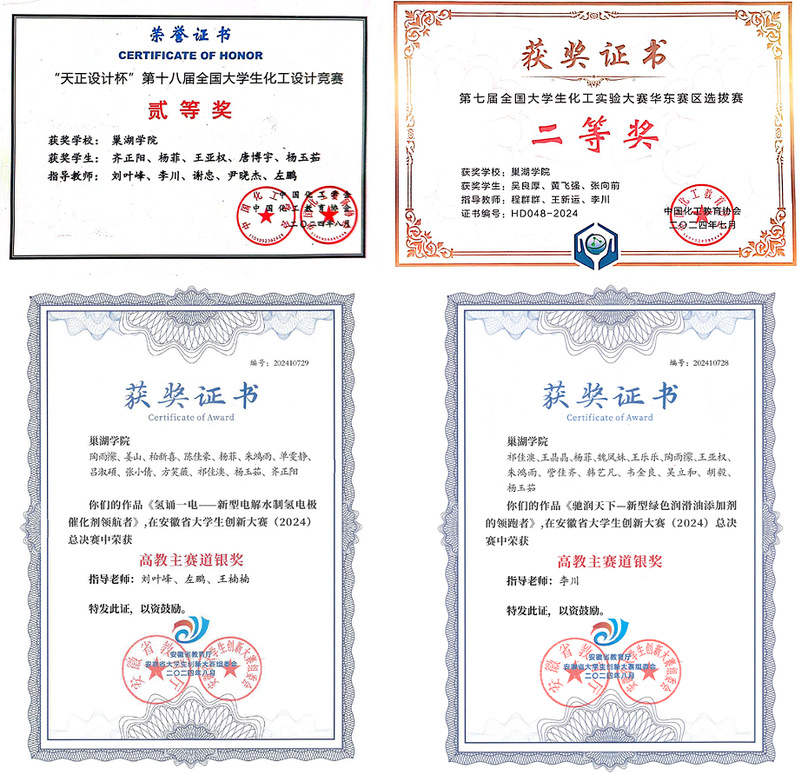 教科研成果:近年來(lái),本專業(yè)教師在綠色能源化工和智能催化等領(lǐng)域取得了重要的突破,主持或參與各級(jí)各類教研和科研項(xiàng)目近40項(xiàng),其中國(guó)家級(jí)、省部級(jí)自然科學(xué)項(xiàng)目10余項(xiàng),高水平學(xué)術(shù)論文100余篇,授權(quán)發(fā)明專利10余件。本專業(yè)高度重視依托專業(yè)學(xué)科競(jìng)賽,培養(yǎng)大學(xué)生的創(chuàng)新創(chuàng)業(yè)能力、團(tuán)隊(duì)協(xié)作精神和拼搏意識(shí)等,教師相關(guān)教科研項(xiàng)目和成果為學(xué)生參加“挑戰(zhàn)杯”全國(guó)大學(xué)生課外學(xué)術(shù)科技作品競(jìng)賽和創(chuàng)業(yè)計(jì)劃大賽、“互聯(lián)網(wǎng)+”大學(xué)生創(chuàng)新創(chuàng)業(yè)大賽、全國(guó)大學(xué)生化工設(shè)計(jì)競(jìng)賽、全國(guó)大學(xué)生化工實(shí)驗(yàn)大賽、全國(guó)大學(xué)生化學(xué)實(shí)驗(yàn)創(chuàng)新設(shè)計(jì)大賽、全國(guó)大學(xué)生化工過(guò)程數(shù)字創(chuàng)新競(jìng)賽等比賽提供了全方位的支持。學(xué)生主持國(guó)家級(jí)、省級(jí)大學(xué)生創(chuàng)新創(chuàng)業(yè)訓(xùn)練計(jì)劃項(xiàng)目20余項(xiàng),并在學(xué)科競(jìng)賽中多次獲得國(guó)家級(jí)獎(jiǎng)項(xiàng)。
