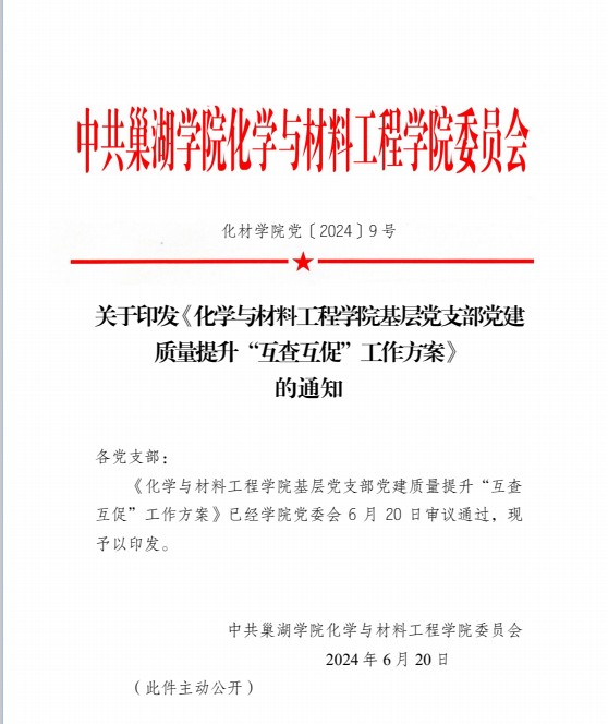 為認真貫徹落實習(xí)近平總書記關(guān)于黨的建設(shè)的重要思想,提升基層黨建工作質(zhì)量,學(xué)院黨委制定《化學(xué)與材料工程學(xué)院基層黨支部黨建質(zhì)量提升“互查互促”工作方案》,并按照方案要求,圍繞“三會一課”制度落實、黨紀教育管理、黨風廉政建設(shè)等黨建工作落實情況,組織開展基層黨支部2024年第二季度“互查互促”工作,并匯總檢查出的問題,指導(dǎo)各黨支部及時查漏補缺,切實抓好問題整改。