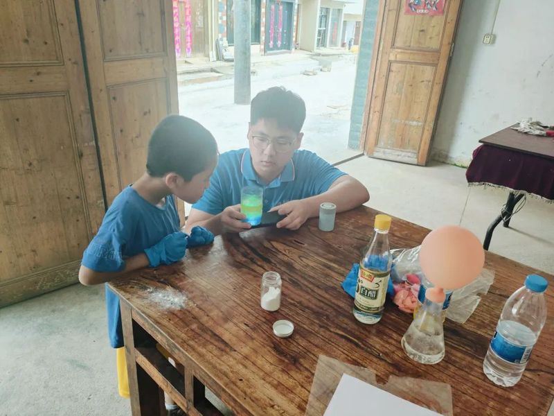 為激發(fā)當?shù)厣倌陜和瘜茖W的興趣,發(fā)現(xiàn)化學之趣和化學之美的好奇心,“筑夢助燃”第二期活動,實踐團成員用專業(yè)知識為此次活動賦能,開展多種多樣的化學實驗。活動通過化學知識講座,簡單、有趣且與日常生活相關(guān)的化學小實驗,以及水彩自制彩虹、二氧化碳吹氣球等趣味實驗,向參與的孩子們科普化學知識,孩子們親眼見證并親自參與了部分實驗,興奮地相互分享著實驗中的所見所聞,傳遞著化學的魅力。