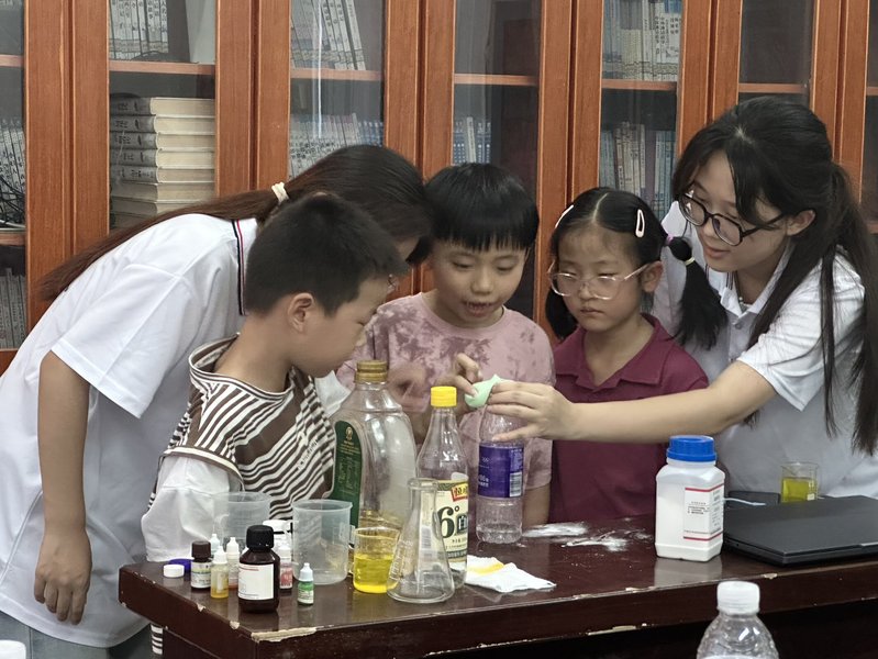 實驗過程中,志愿者們還結合具體現象,向小朋友們介紹實驗器材,普及基礎化學知識,以及生活中常見的化學現象,讓抽象的科學知識變得生動易懂?;顒拥奈猜暎∨笥褌兣c志愿者圍坐一起,合影留念,錄制互動視頻,記錄下他們傳播和收獲知識的喜悅。
